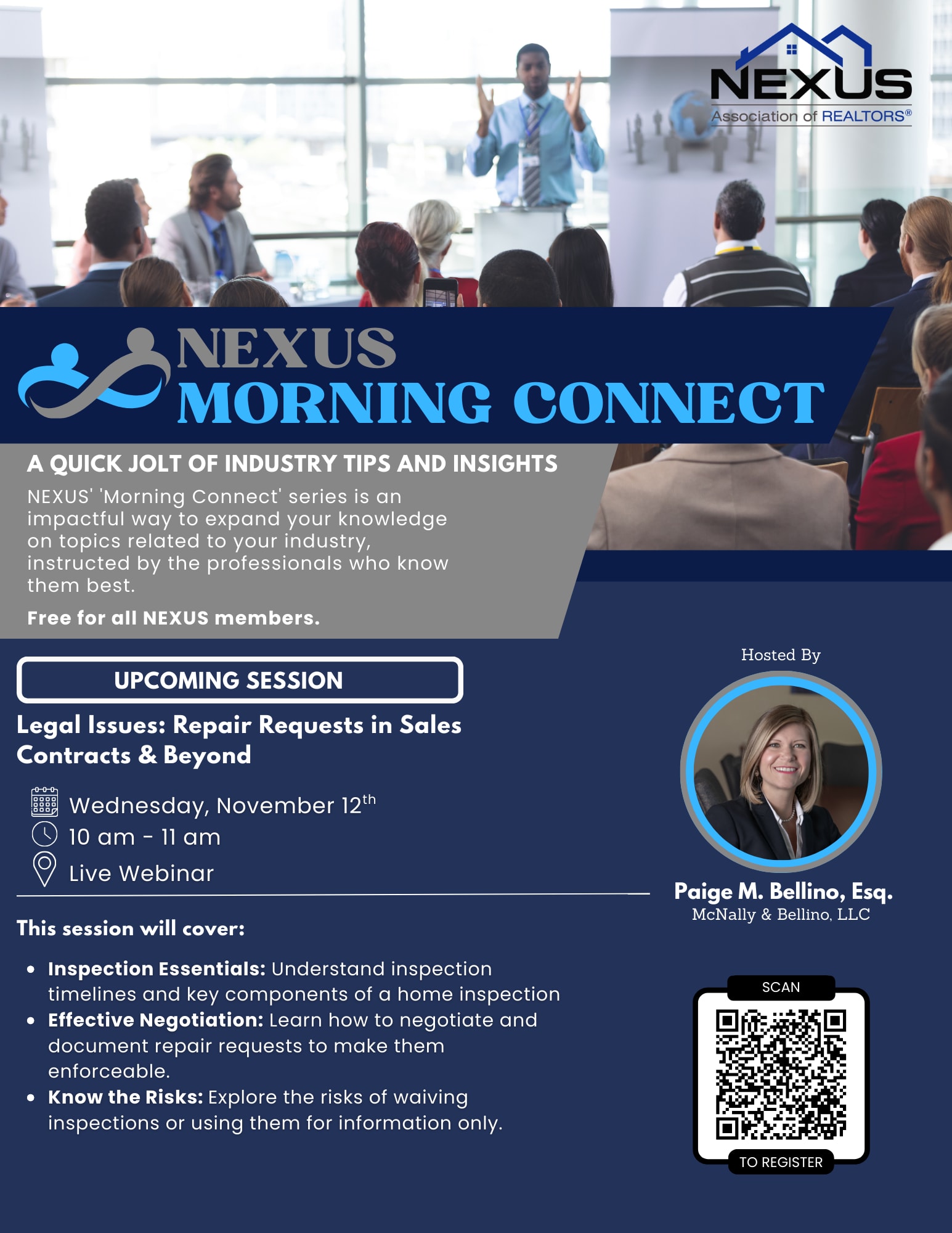 *The opinions and viewpoints expressed by instructors and speakers of NEXUS Morning Connect do not necessarily reflect those of the NEXUS Association of REALTORS®. We encourage members to approach all information presented in their classes with independent analysis.