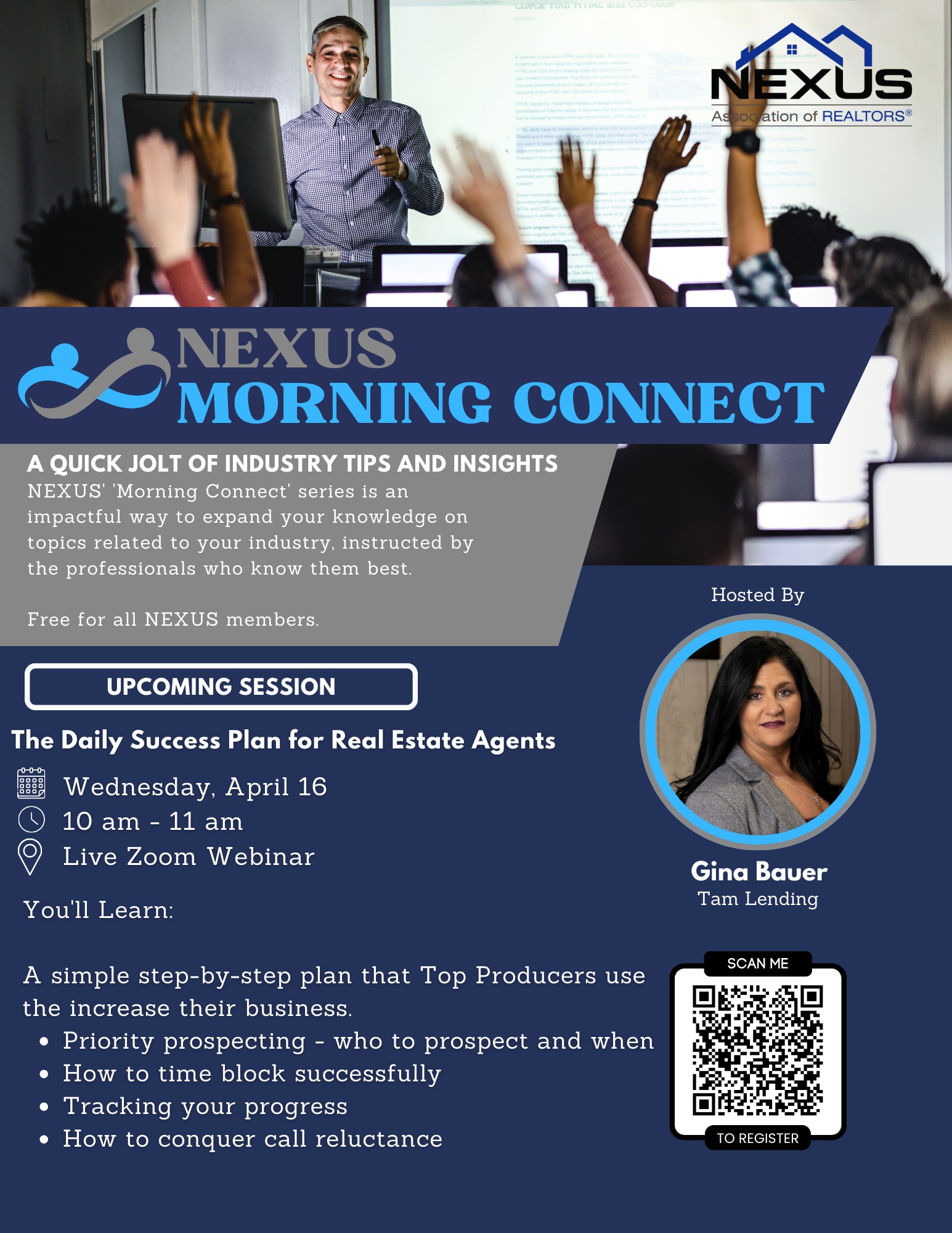 *This class is a webinar. The opinions and viewpoints expressed by instructors and speakers of NEXUS Morning Connect do not necessarily reflect those of the NEXUS Association of REALTORS®. We encourage members to approach all information presented in their classes with independent analysis.